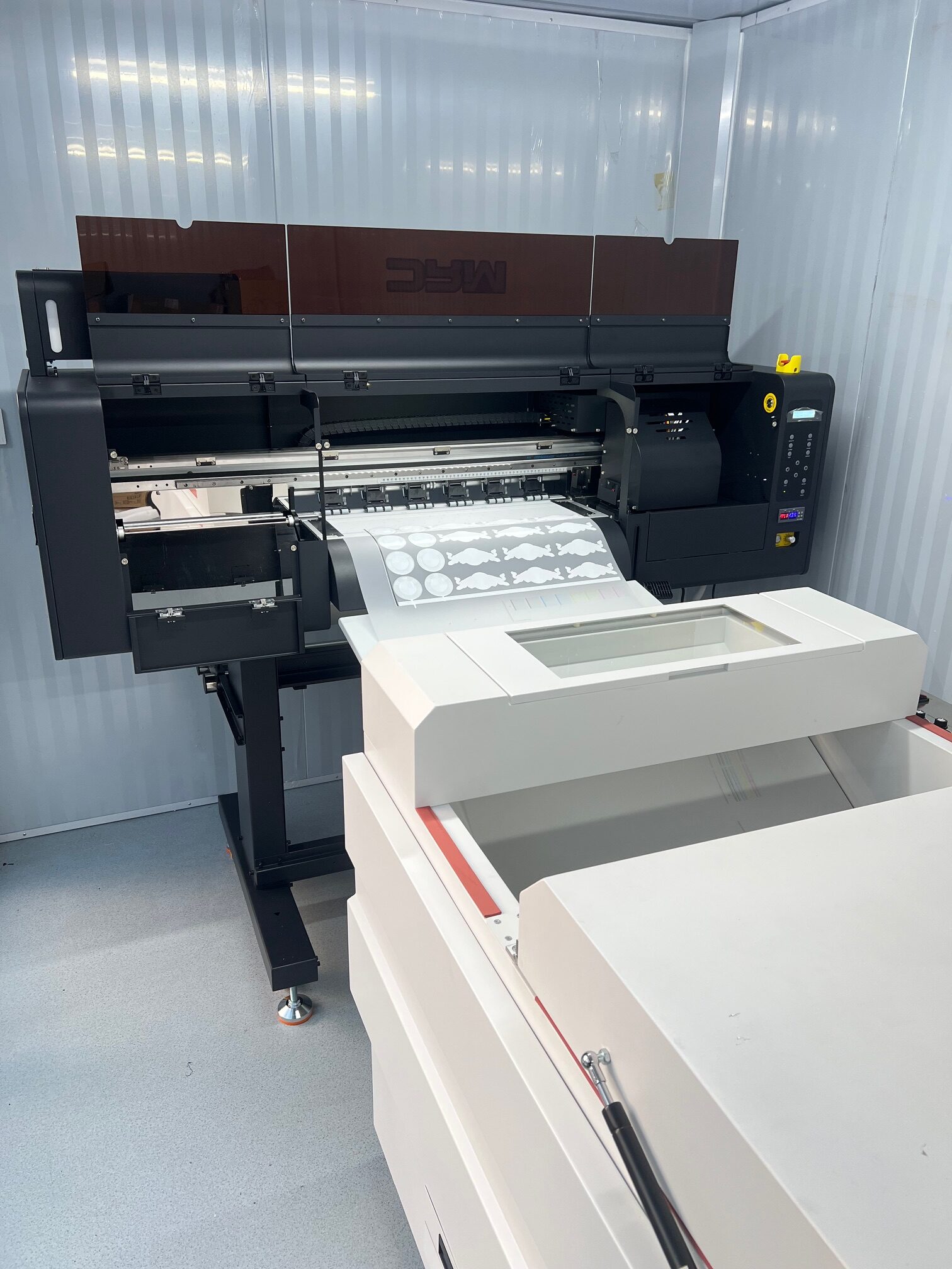 After startup, we created test designs, checked color accuracy, white density, details, and repeatability. The goal was for the client to immediately receive results suitable for real production use.